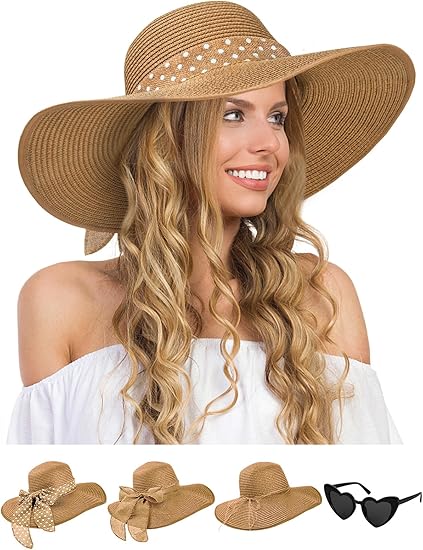 Womens Sun Hat - Wide Brim Floppy Beach Hats for Women Foldable Straw Hat with Heart Shaped Sunglasses UPF 50+